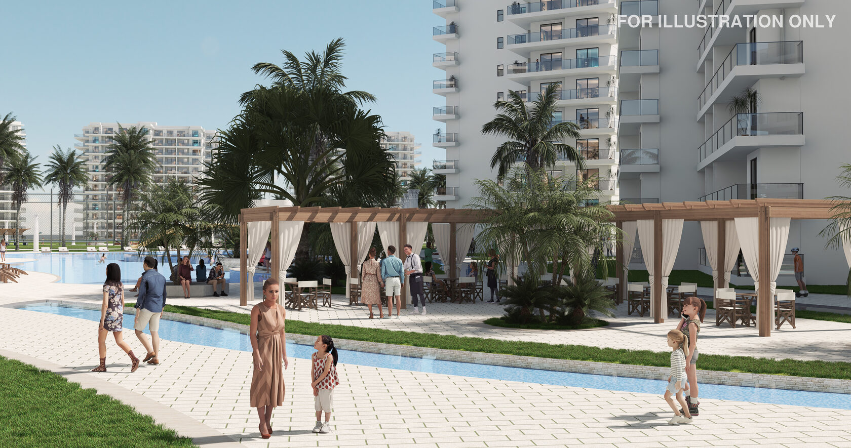 Также к услугам резидентов: супермаркеты, рестораны, бары, СПА-центр (сауна, хаммам, массаж, соляная пещера), салоны красоты и вечерние развлекательные программы. Многие преимущества комплекса, включая трансфер на пляж каждый час и Wi-Fi в общественных зонах, предоставляются бесплатно.