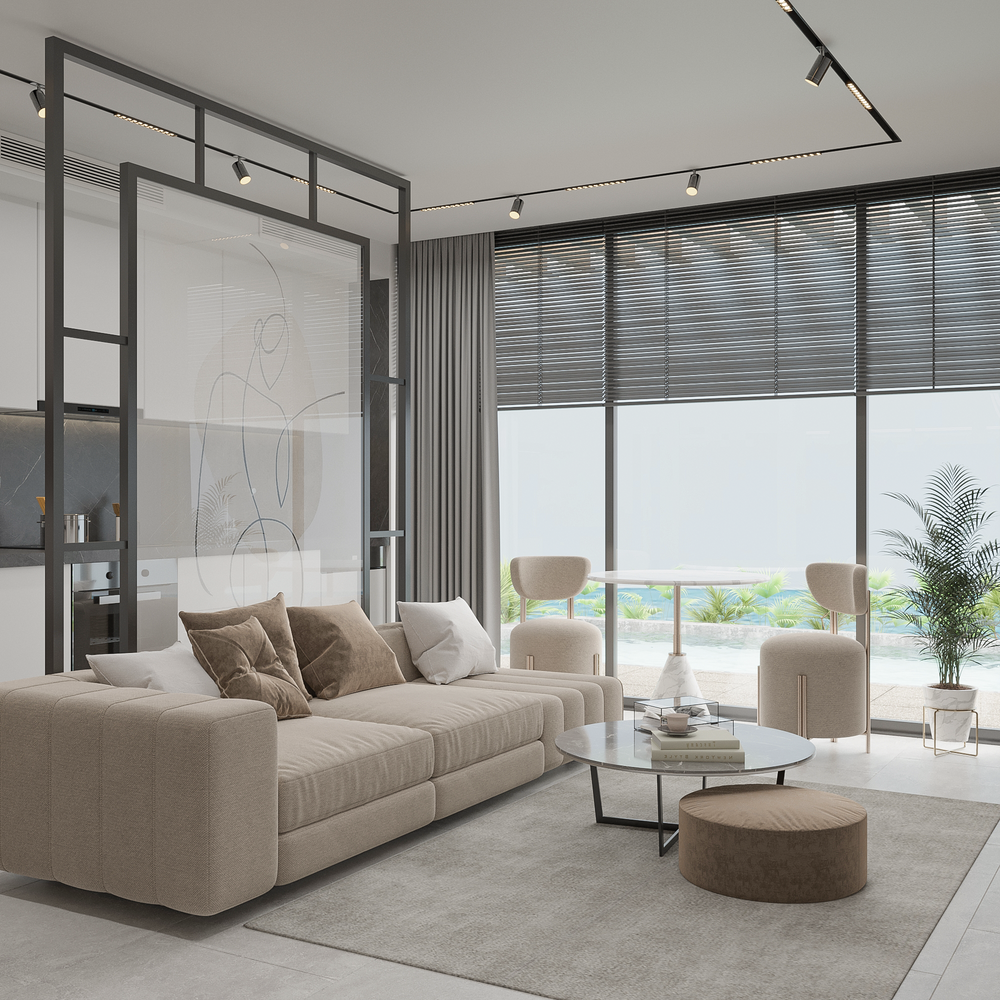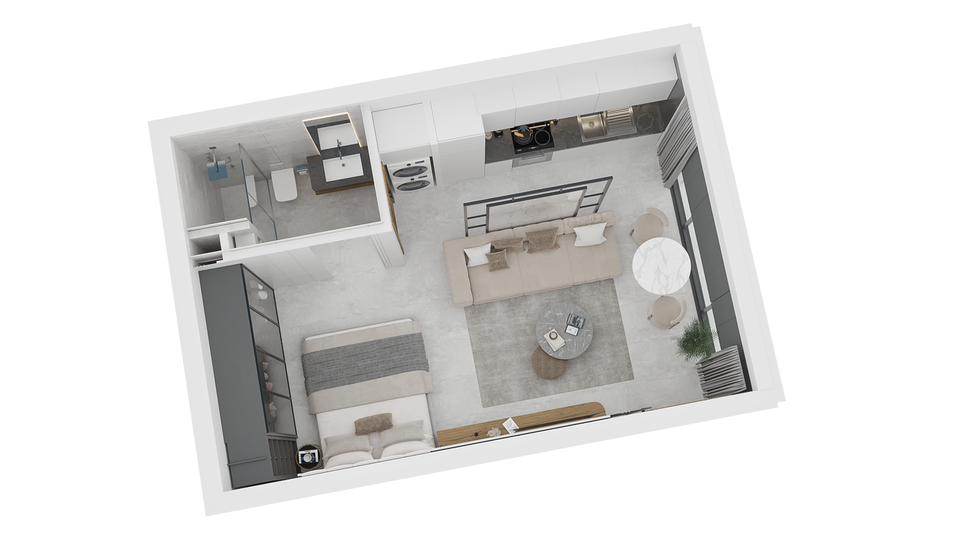 Современная студия формата 1+0 — функциональная планировка, качественная отделка, вид на море/территорию комплекса (подставишь нужное), возможность размещения под аренду или комфортного проживания.