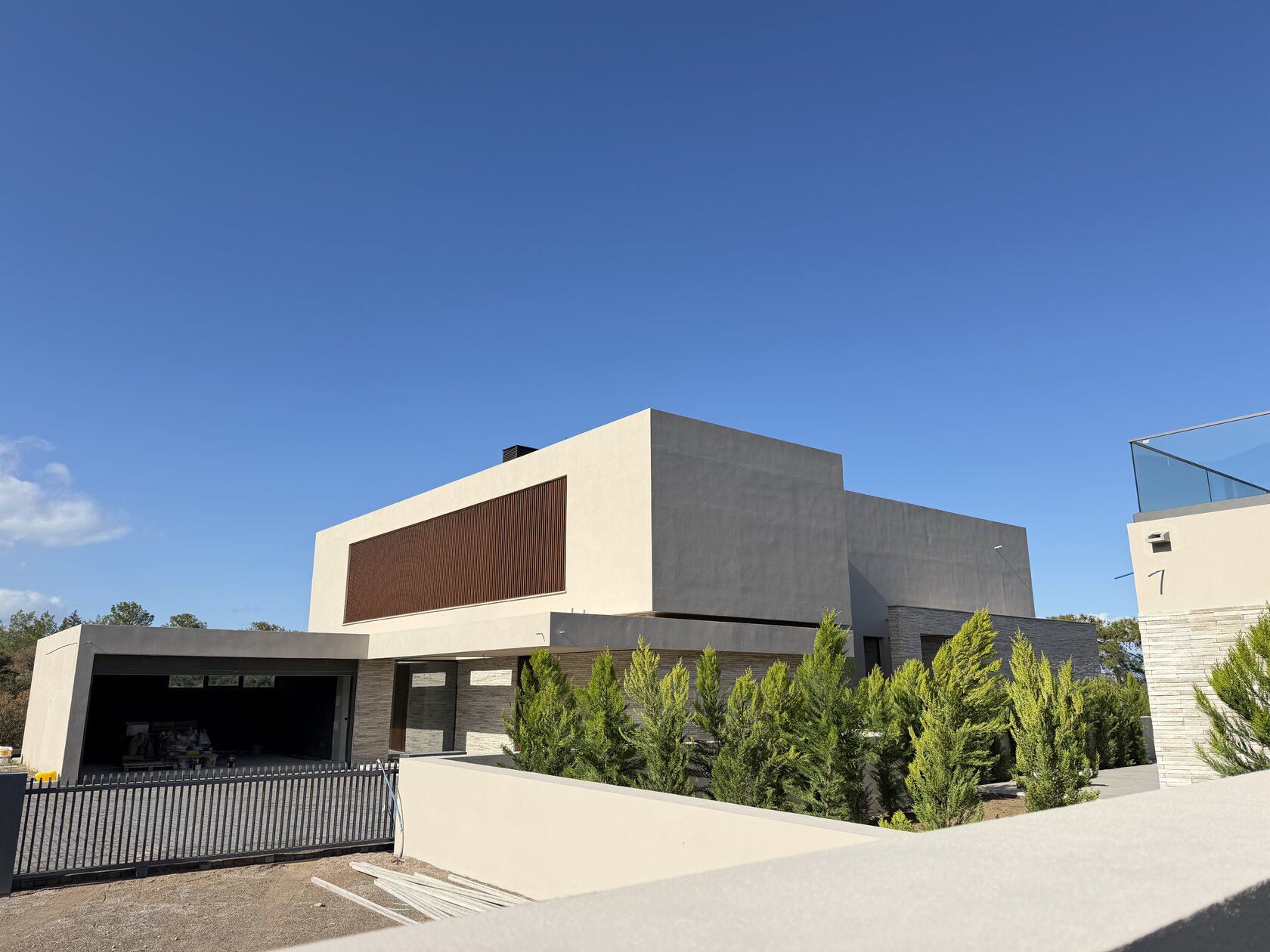 Вилла расположена на огромном участке площадью 1380 м², где главную роль играет приватный бассейн и террасы в общей сложности 157 м². Здесь предусмотрено всё для вашего комфорта: от просторного гаража до скрытых систем кондиционирования и вентиляции, интегрированных в архитектуру здания.